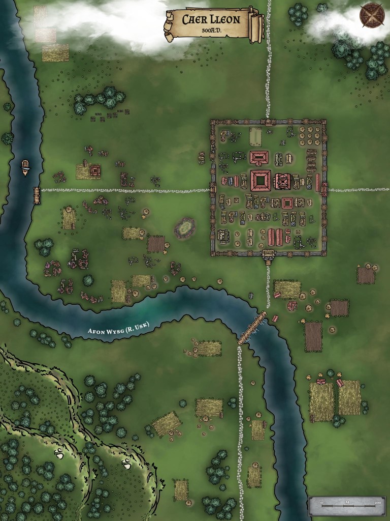 So if Arthur was not a king, and only a military commander in the region of modern day Wales, where might his base have been? At least as early as Geoffrey of Monmouth’s 12th century manuscript, he puts Arthur’s capitol at Caerleon. Later, the French writer Chretien de Troyes attributes his capitol at Camelot. Well, Caerleon was a massive Roman legionary fort, in Wales. Specifically, it’s near the southeastern border of Wales- a good location for a base of operations to fight against Saxons who were invading from southeast England. True, the fort was largely abandoned by the Romans in around 300 A.D., but people most likely continued to live there. So for my purposes, Caerleon was as good a place as any to establish Arthur’s headquarters at. Finally, I decided to also use Tintagel, in Cornwall, as Arthur’s birthplace because, again, it’s how Geoffrey of Monmouth portrayed events (and most writers since then) and it seemed reasonable.